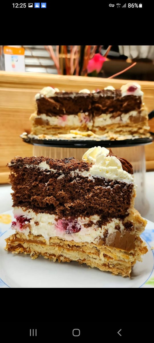 Torta preparada elaborado con bizcochos de soletilla mojados en café, cubiertos con una mezcla batida de yemas de huevo, azúcar y mascarpone , y aromatizado con cacao en polvo con un bizcocho de chocolate, remojo Vainilla, crema chantilly chocolate y ganach.