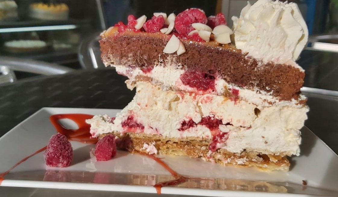 Torta compuesta por discos de Hojarasca, relleno de frambuesas, manjar, crema chantilly y crema pastelera.