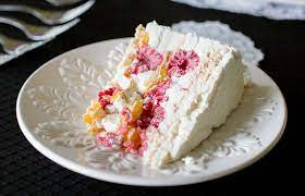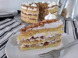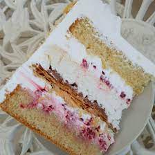 Torta preparada con un bizcocho de vainilla, disco de merengue frambuesas, disco de hoja, manjar y crema chantilly.