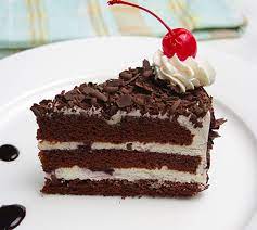 Torta preparada por Bizcocho chocolate con suave remojo de cacao, relleno con crema chantilly, mermelada de frambuesas, decorado con marrasquino y ramas de chocolate.